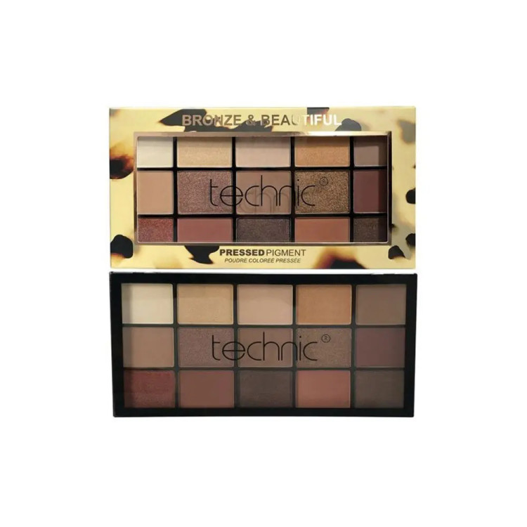 پالت سایه BRONZE & BEAUTIFUL تکنیک TECHNIC دارای 15 رنگ کاربردی و چشم نواز است که مناسب آرایش روزانه و شب بانوان خوش سلیقه می باشد. این پالت سایه با قابلیت بالای ترکبب رنگ ها و بلندینگ آسان یک انتخاب عالی برای افراد حرفه ای و مبتدی محسوب می شود. این محصول حاوی رنگدانه های غنی است و با جلوه مات و براق زیبایی چشم ها را دوچندان می کند.